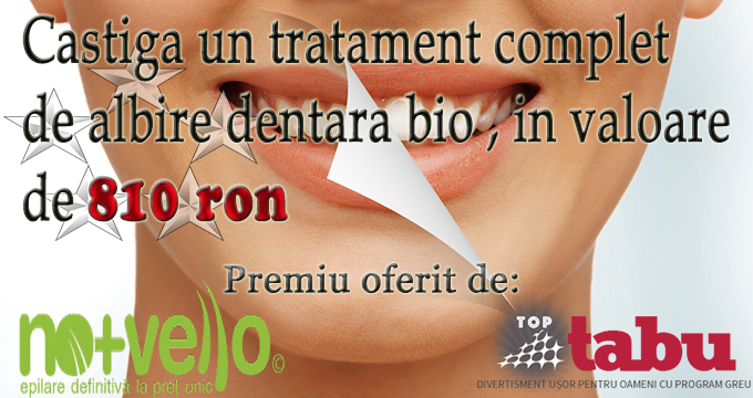 Nomasvello Romania si TopTabu te premiaza cu un tratament de albire dentara bio! Tot ce trebuie sa faceti este sa urmati pasii de mai jos: