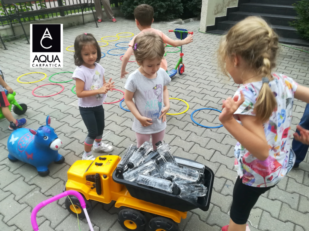 De data aceasta, sticlele cu apa oferite de Aqua Carpatica ne-au ostoit setea dupa ce au fost transformate in material didactic si s-au “plimbat” prin cercurile colorate intinse pe asfalt.