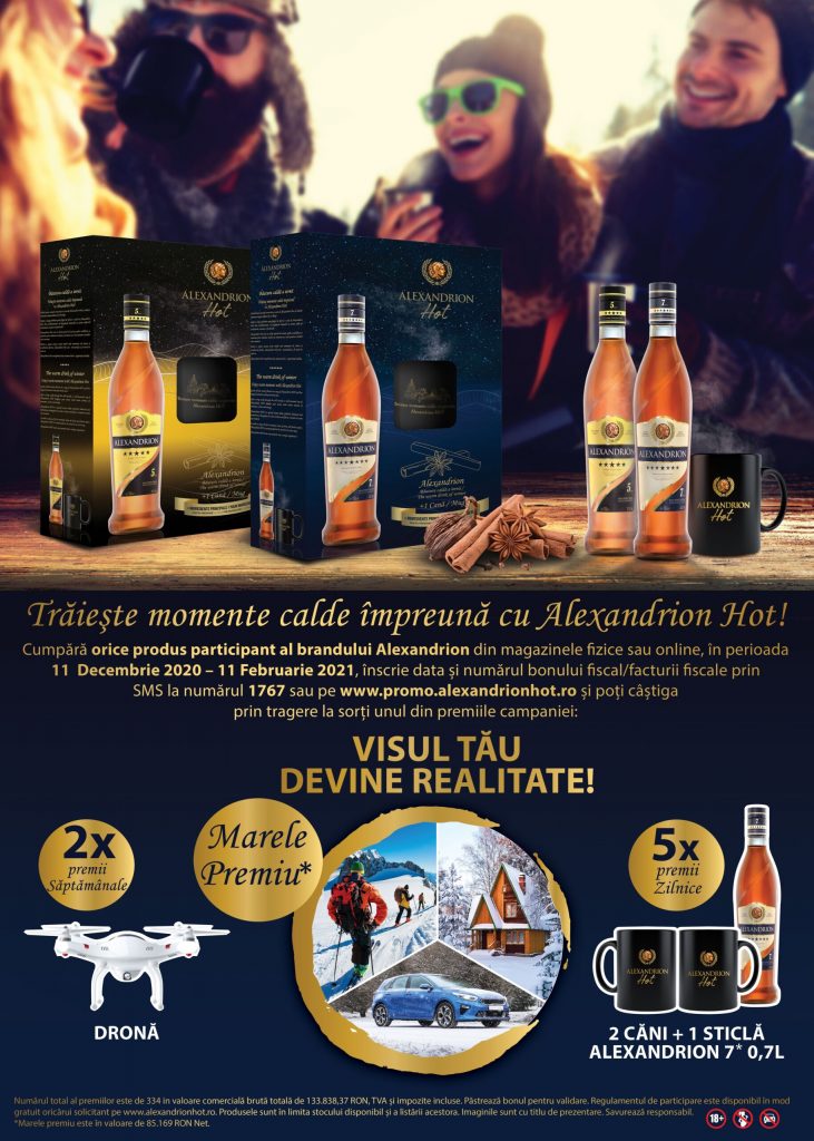În perioada 11.12.2020-11.02.2021 cumpără orice produs participant Alexandrion – Alexandrion HOT (pachet cu Alexandrion 5* sau 7*, cană şi ingrediente pentru preparea băuturii), Alexandrion 7* (1 L, 0,7 L şi 0,5 L) şi Alexandrion 5* (1,75 L, 1 L, 0,7 L şi 0,5 L), trimite SMS cu data şi numărul bonului fiscal la 1767 sau ȋnscrie-te pe site-ul campaniei www.promo.alexandrionhot.ro.